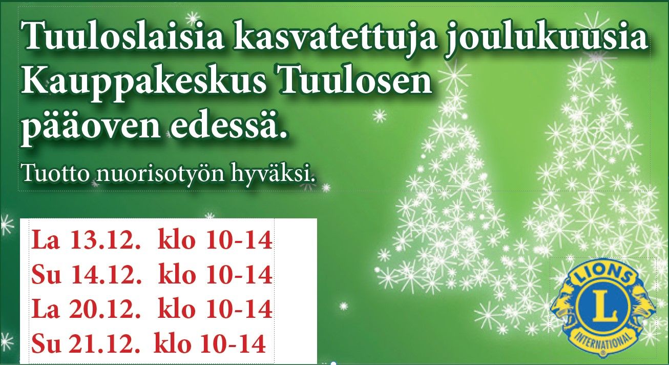 2025 Joulukuusia LC Tuuloksen toimestaKauppakeskus Tuulosessa perinteinen LC Tuuloksen hyväntekeväisyys joulukuusimyynti jälleen joulun alla. Tuuloslaisia kasvatettuja joulukuusia. Tuotto nuorisotyön hyväksi.