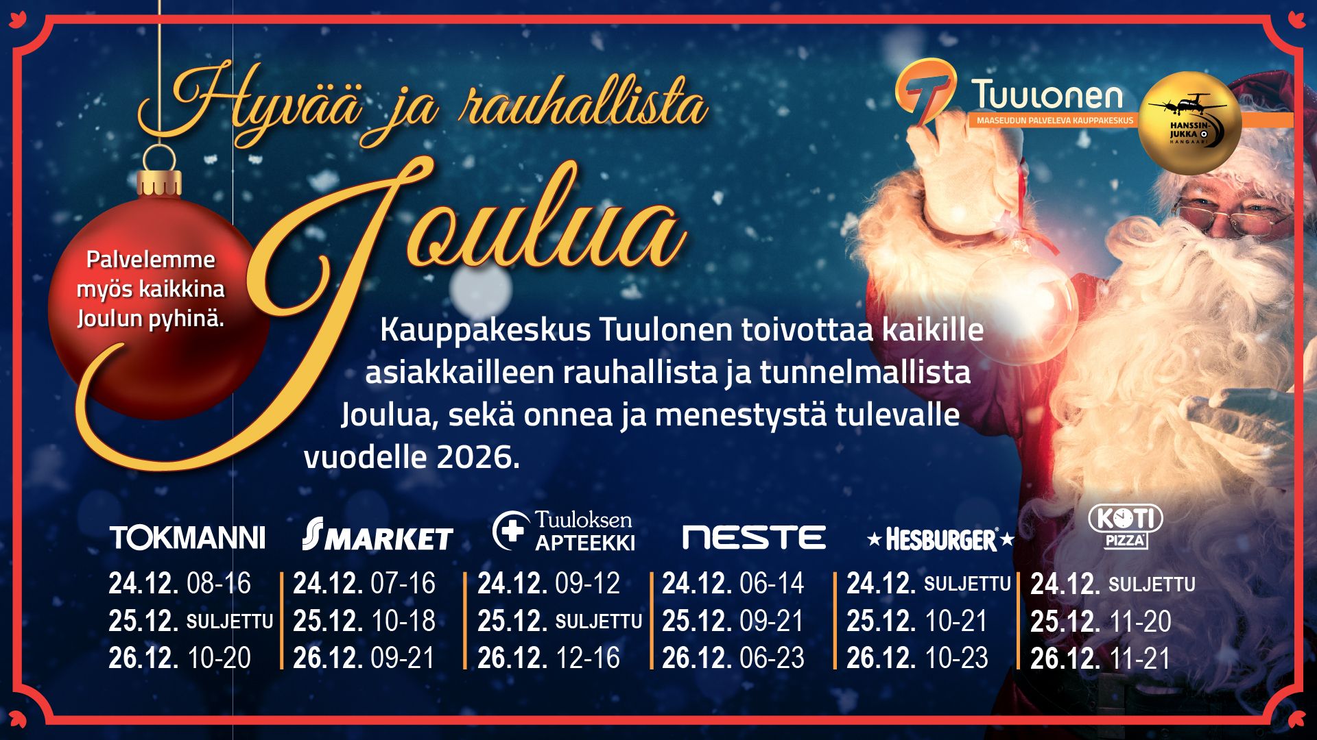 2025 Tuulonen palvelee joulunaKauppakeskus Tuulonen avoinna joulun jokaisena päivänä. Osa liikkeistä suljettu ja osalla poikkeavia aukioloaikoja. Ohessa listaa kysytyimpien liikkeiden joulun aukioloajoista. Liikekohtaiset aukiolot löydät liikkeiden alasivuilta.